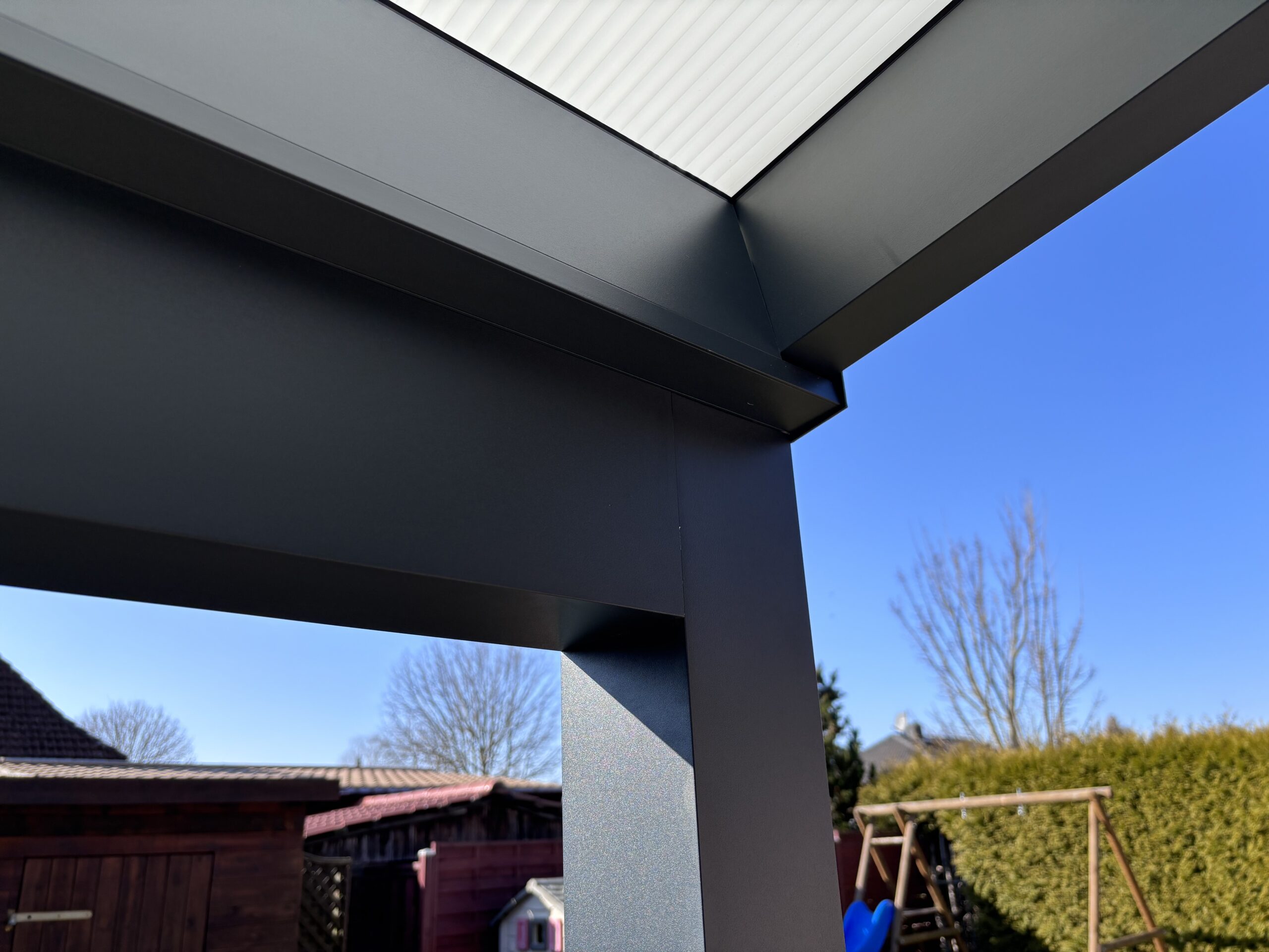 - Entwässerung: Integrierte Regenrinne mit Ablauf in der Säule (verdeckte Ableitungen)